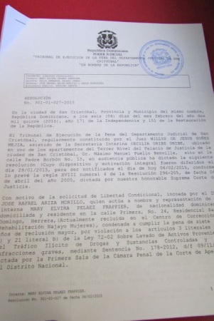 El juez de ejecución de la Pena del Distrito Judicial de esta provincia licenciado, Wallis De Jesús, dispuso su libertad condicional esta mañana. Ella había solicitado solicitado su libertad en tres oportunidades, en dos de las cuales le fue negada por la oposición del ministerio público, quien argumentó que ella no había resarcido los daños provocados a la sociedad por los hechos cometidos.
