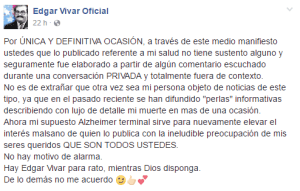 El artista que también dio vida a “Ñoño” en El Chavo del Ocho, calmó a sus seguidores, casi un millón y medio en Facebook. “No hay motivo de alarma. Hay Edgar Vivar para rato, mientras Dios disponga”.