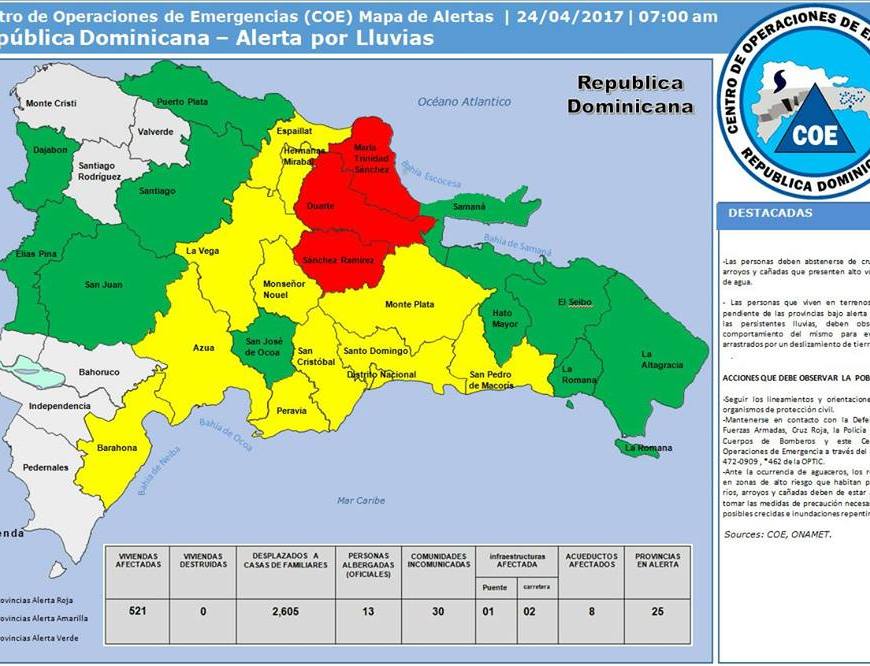 El Centro de Operaciones de Emergencias (COE) elevó el nivel de alerta roja a tres provincias. La medida persigue proteger a los residentes en zonas vulnerables, ante la crecida de ríos, arroyos y cañadas. Las tres provincias en alerta roja son María Trinidad Sánchez, Duarte y Sánchez Ramírez. Con especial atención en la zona del Bajo Yuna. El informe número diez emitido por el … Continúa leyendo COE amplía alerta roja a tres provincias; 22 se mantienen en verde y amarilla