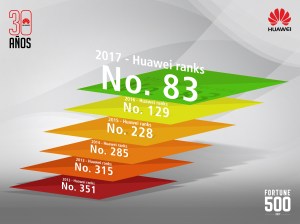 Como sucede cada año, la revista Fortune ha publicado su lista reconociendo a las 500 empresas más importantes a nivel mundial, y por octavo año consecutivo, Huawei está presente en este ranking, pasando del puesto 129 al 83, colocándose por primera vez en el Top 100 (con una ganancia de $78 mil 511 millones de dólares), ubicándose por encima de empresas como Sony, Lenovo, Nokia, Intel, Nike y Coca-Cola, además de mantenerse dentro del selecto grupo de empresas chinas que figuran en esta lista, que hasta 2017 incluye a 109, tomando aquel país un rol de representación predominante en esta lista que incluye a compañías de 34 países.