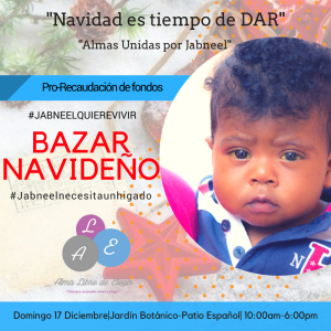 Los padres del pequeño Jabneel, Joel Cruz y Maribel Soto, informaron que Jabneel necesita un trasplante de hígado y no cuentan con los recursos necesarios para cubrir los gastos de la cirugía, por un costo de RD$6,000,000.00. Es por esto que la Comunidad Alma Libre de Elegir (ALE), aportará su granito de arena con la creación del bazar Navideño “Almas Unidas por Jabneel”, que se llevará a cabo este domingo 17 de diciembre en el Patio de Uma, ubicado en la avenida Gustavo Mejía Ricart, del ensanche Naco, en horario de 10:00 a.m. a 6:00 p.m.