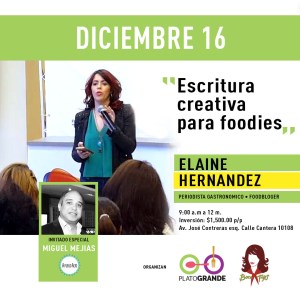Santo Domingo.- El próximo sábado 16 de diciembre, en las instalaciones del centro de negocios, Coffice.do, se impartirá el taller “Escritura creativa para foodies” a cargo de la Foodblogger y periodista gastronómica, Elaine Hernández Pión.