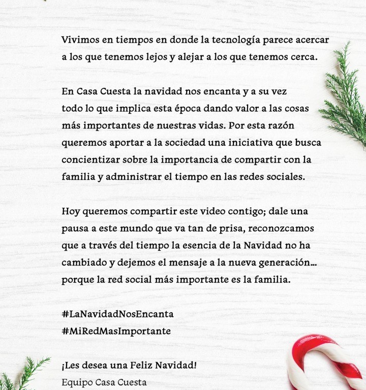 Esta iniciativa de Navidad de Casa Cuesta, #LaRedMasImportante, está recogida en un audiovisual que muestra como un padre le escribe una carta a su hija para que recuerde que no importa el tiempo que pase ni lo rápido que vaya el resto del mundo, lo esencial de la Navidad nunca cambia, y la red social más importante, es y siempre será la familia.