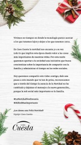 SANTO DOMINGO.- La Navidad es una época perfecta para recordar y reforzar los valores familiares. Es por esto que Casa Cuesta quiso aportar a la sociedad una iniciativa que busca concientizar sobre la importancia de compartir con la familia y administrar el tiempo en las redes sociales.