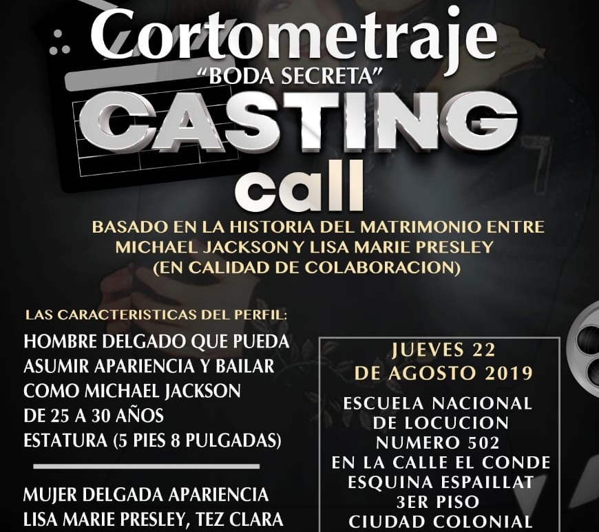 La productora Mnovas Films abre convocatoria de casting para el jueves 22 de agosto de este año 2019 en búsqueda de los actores protagonistas para el rodaje del cortometraje “Boda Secreta”, basado en la historia del matrimonio entre Michael Jackson y Lisa Marie Presley. (En calidad de colaboración). Las características del perfil buscado son: Hombre delgado que pueda asumir apariencia y bailar como Michael Jackson, de 25 a 30 años. 1.75 metros … Continúa leyendo Mnovas films abre convocatoria a casting de cortometraje