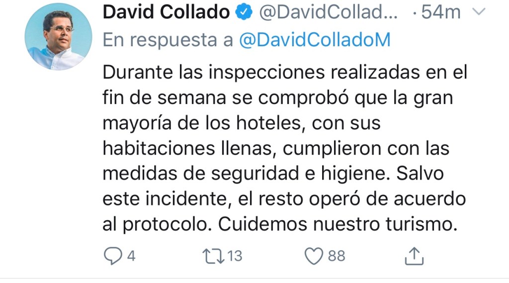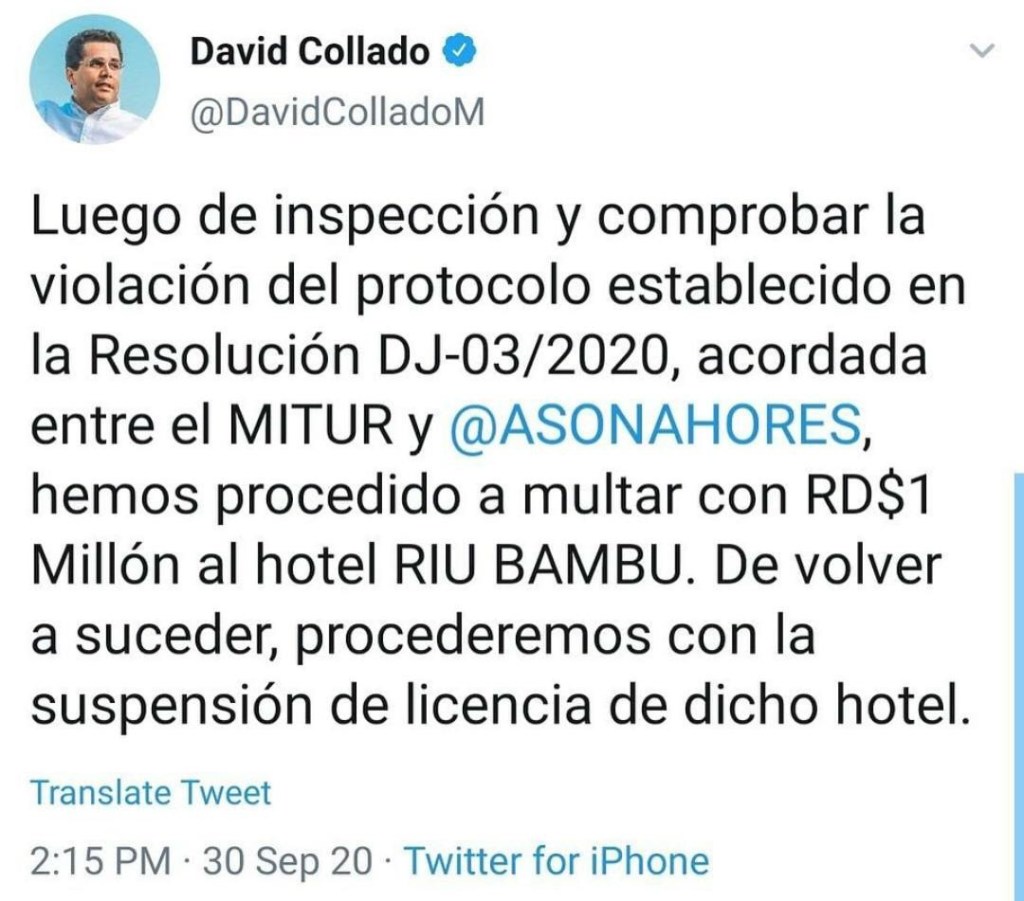 «Luego de inspección y comprobar la violación del protocolo establecido en la Resolución DJ-03/2020, acordada entre el MITUR y @ASONAHORES, hemos procedido a multar con RD$1 Millón al hotel RIU BAMBU», Posteo Collado, en su red social de twitter.