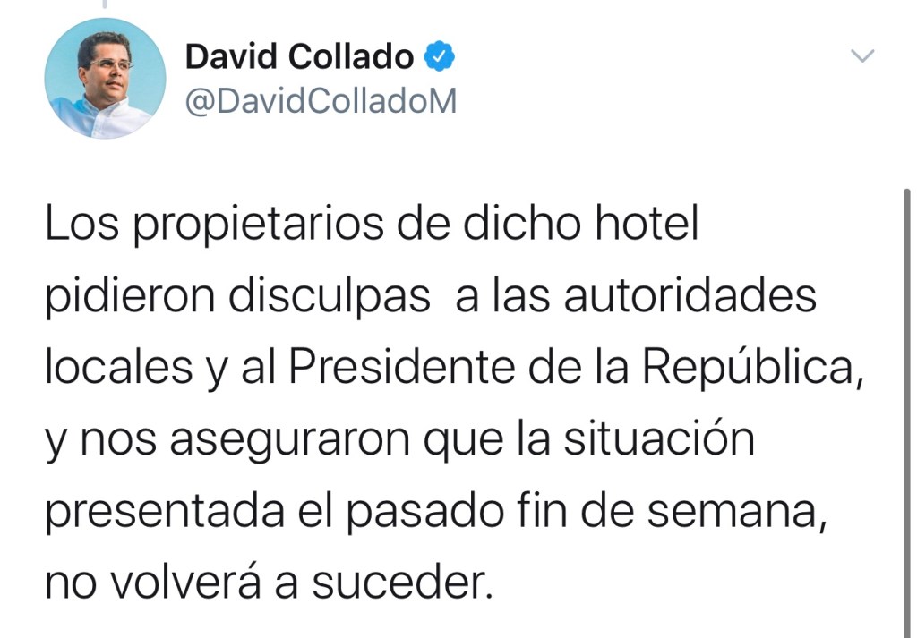 Los propietarios del hotel pidieron disculpas a las autoridades locales y al Presidente de la República, y nos aseguraron que la situación presentada el pasado fin de semana, no volverá a suceder.