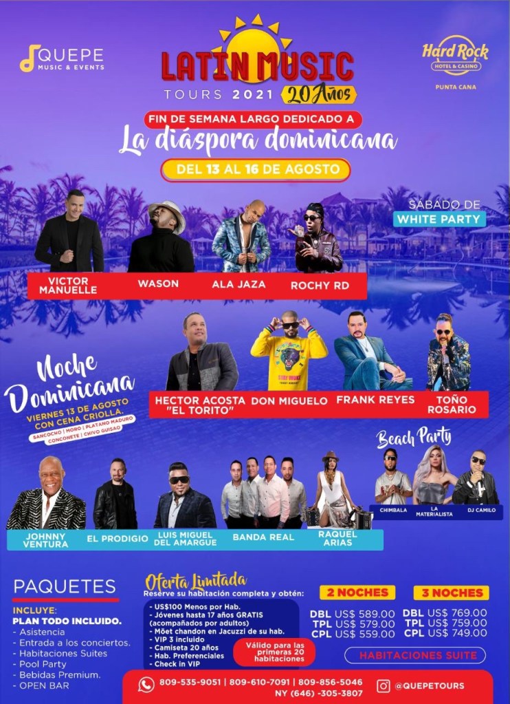SANTO DOMINGO. RD.- Quepe Music & Events y Hard Rock Hotel & Casino Punta Cana, anuncian la cartelera artística de la celebración de los 20 años del más importante evento artístico-turístico del país, a ritmo de merengue, bachata, salsa, merengue típico y música urbana, dedicado este año a la Diáspora Dominicana, el fin de semana largo del 13 al 16 de agosto próximo.