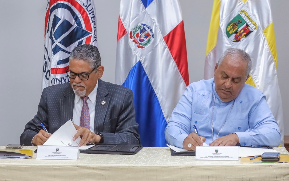 Pedro Antonio Quezada, rector del ITSC, y monseñor Ramón Benito Ángeles Fernández, rector de la UCSD, dejaron establecido los beneficios que en lo adelante recibirán los colaboradores del centro, entre ellos capacitación, investigaciones, emprendimiento e innovación en las áreas de interés recíproco.