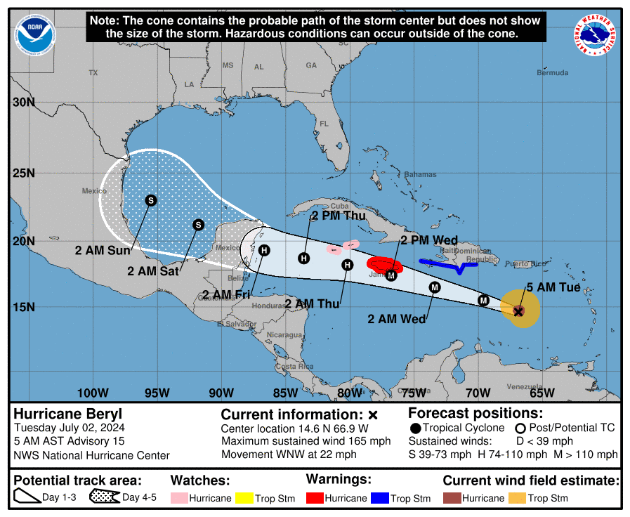 «El debilitamiento debería comenzar más tarde hoy, pero aún se espera que Beryl siga siendo un huracán importante», asegura el Centro Nacional de Huracanes de Estados Unidos.