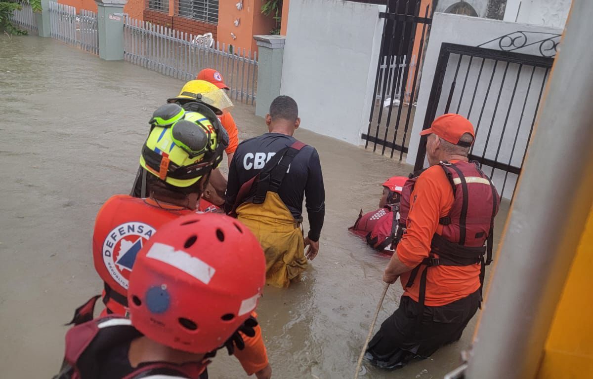 Santo Domingo.- Rescatistas de la Defensa Civil Dominicana realizan desde este martes y la madrugada del miércoles, labores preventivas y de respuesta en las zonas afectadas por las lluvias, provocadas por una vaguada en altura que incide sobre el país.