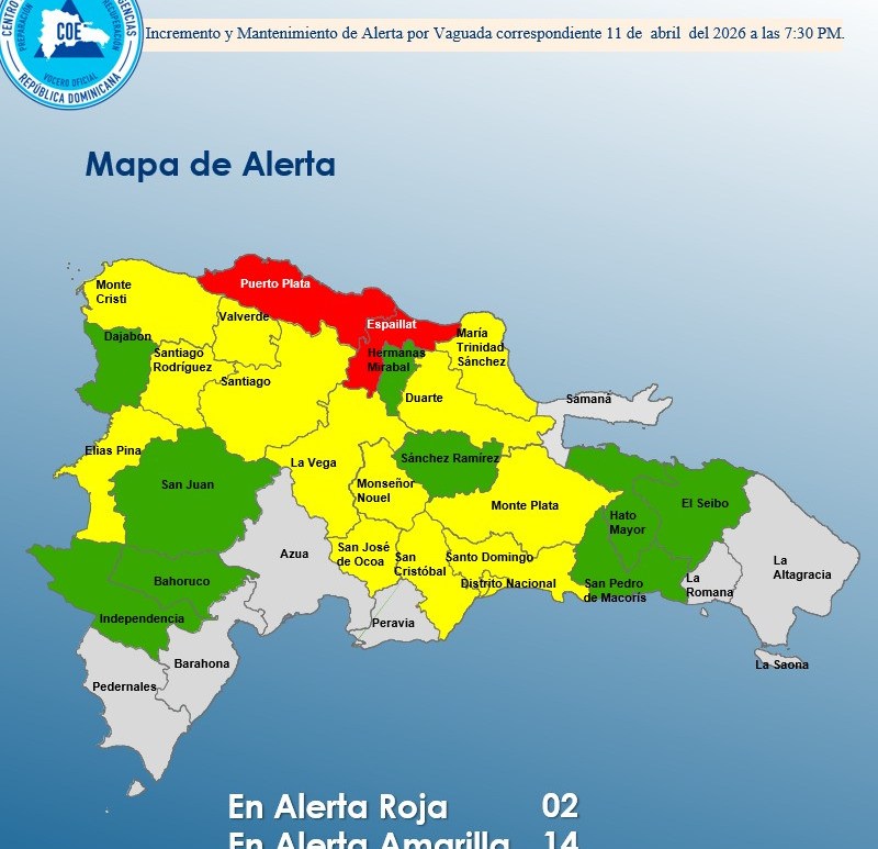 Santo Domingo. — El Centro de Operaciones de Emergencias (COE) incrementó los niveles de alerta en distintas provincias del país ante la continuidad de aguaceros moderados a fuertes, acompañados de tormentas eléctricas, ráfagas de viento e incluso granizadas en algunas zonas. Las provincias Puerto Plata y Espaillat se mantienen en alerta roja, mientras que en alerta amarilla figuran Monseñor Nouel, Santiago Rodríguez, Santiago, La Vega, … Continúa leyendo Puerto Plata y Espaillat en alerta roja; COE eleva niveles en varias provincias